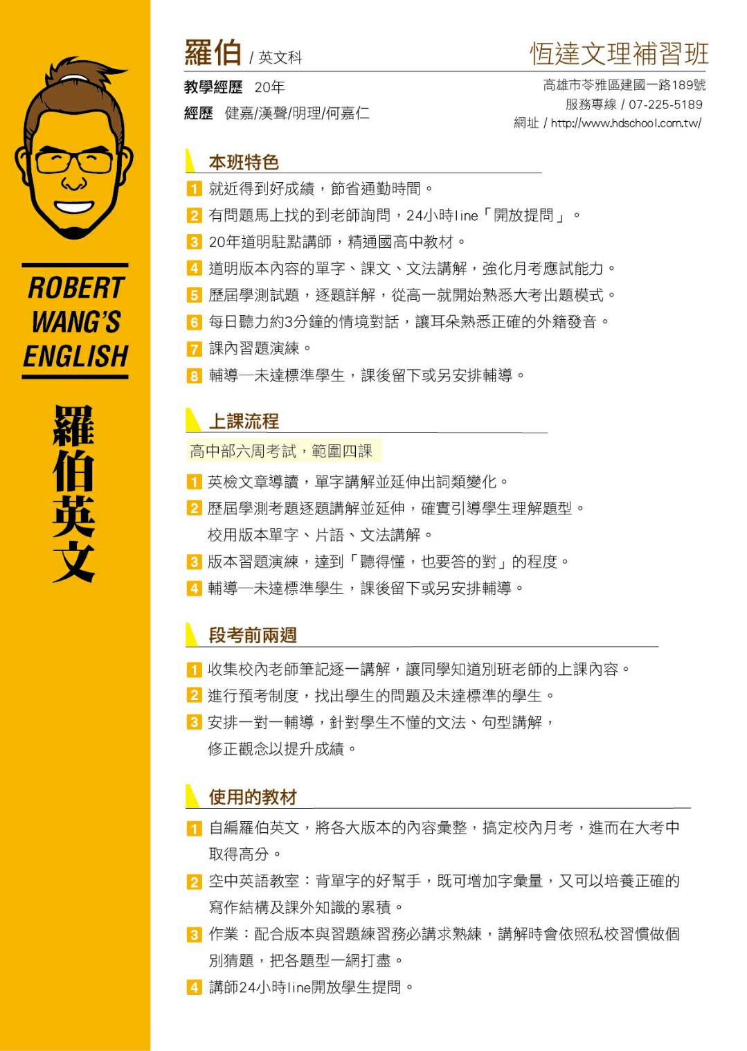 1.自編羅伯英文、將各大版本的內容彙整,以輕鬆卻不失專業的方式授課,讓學生在哈哈大笑中學習且印象深 刻。