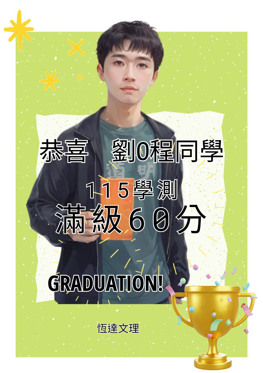 恭喜🎉 本班學生 115學測滿級分 校排1%,真的太強了! 2026/3/13 0:0 back 會考5A10+猶在眼前,一晃眼就學測滿級分 從小六來到恆達至高三,一路來,老師們看到的是他的自律及自我要求。 滿級分是靠他「自身的努力」,我們與有榮焉! Attachment: TOP